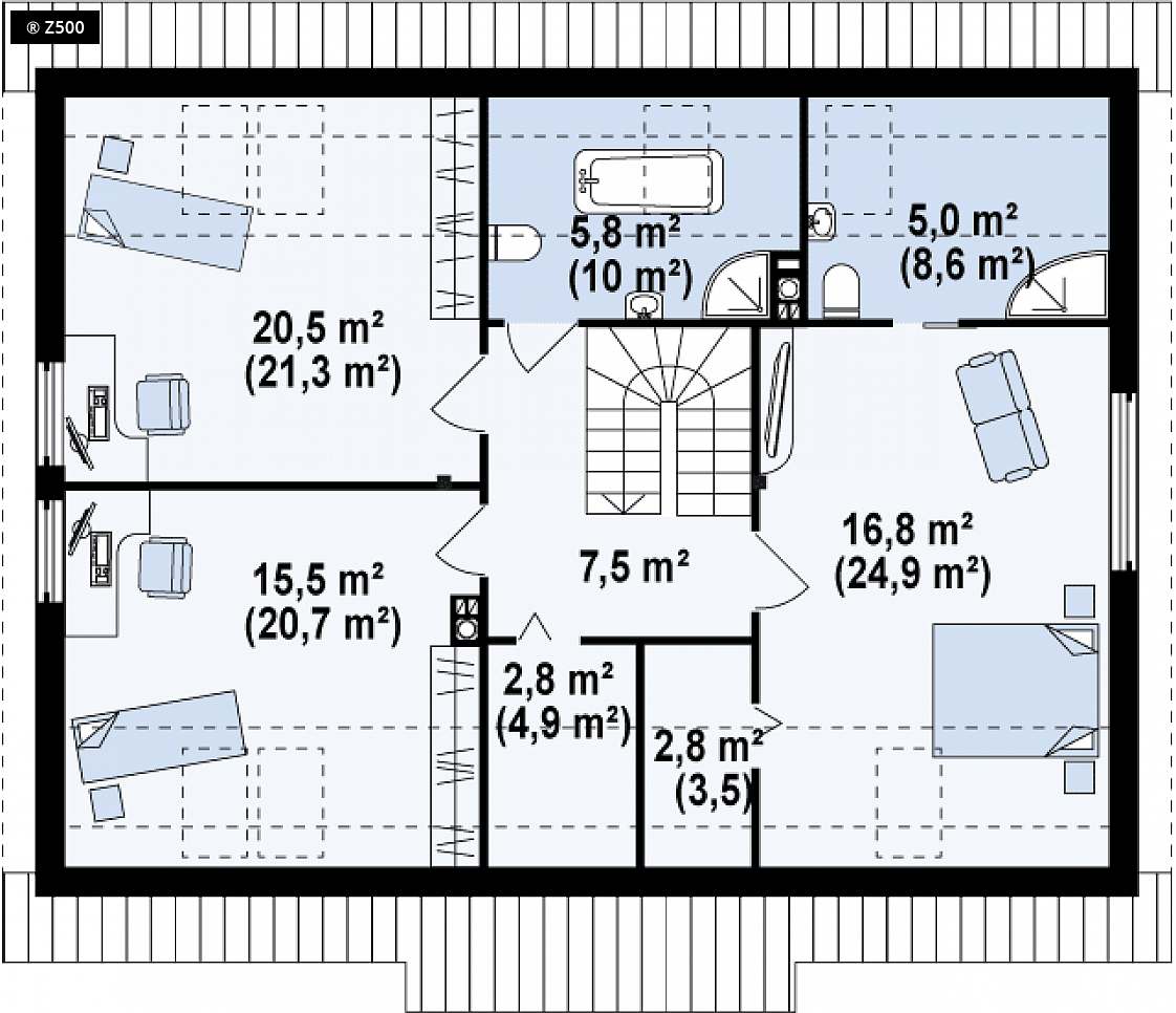 Dach: dwuspadowy, nachylenie 35°, pokrycie z dachówki, blachodachówki