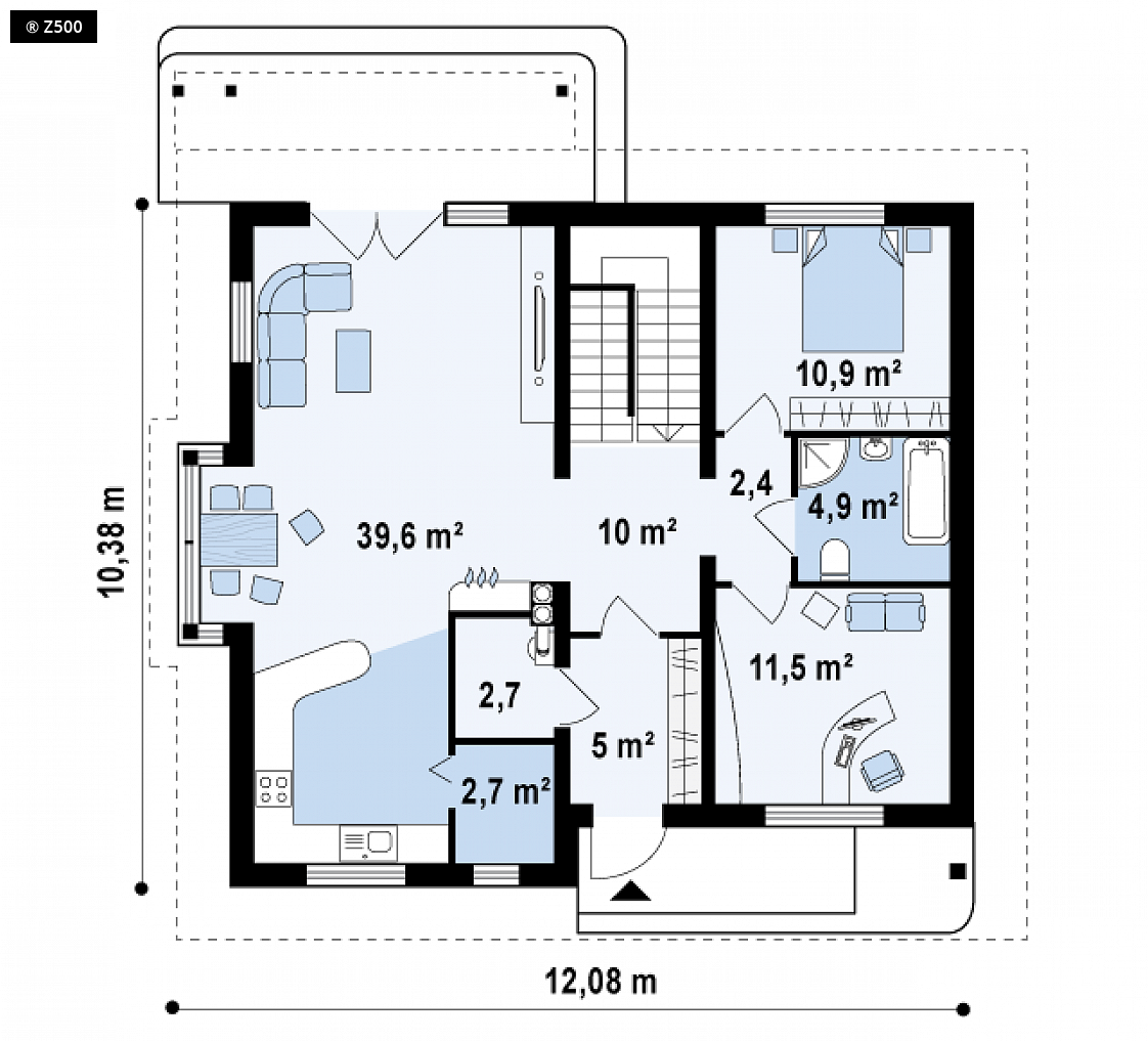 Z104 to projekt domu z użytkowym poddaszem. Cechuje go prosta, elegancka forma z odrobiną nowoczesnych rozwiązań. Efektowne wkomponowanie drewnianych elementów nadaje mu ciekawy i niepowtarzalny wygląd. Front domu posiada zadaszone wejście, które dalej prowadzi nas do sieni i pomieszczenia gospodarczego. Na parterze usytuowany jest przestronny gabinet oraz spora sypialnia. Kwadratowy kształt łazienki pozwala na wygodne jej urządzenie. Dużą zaletą tego projektu jest przestronna, funkcjonalna kuchnia, która spełni wymagania każdej pani domu. Salon połączony jest z jadalnią, w której cała rodzina może wspólnie jadać posiłki. Na poddaszu znajdują się trzy widne pokoje, łazienka z miejscem na dużą wannę a nawet garderoba. Projekt domu Z104 łączy w sobie piękno architektury oraz funkcjonalność. Z każdej strony dom prezentuje się atrakcyjnie a jego ciepło i urok sprawi że każdy domownik znajdzie w nim miejsce dla siebie.
