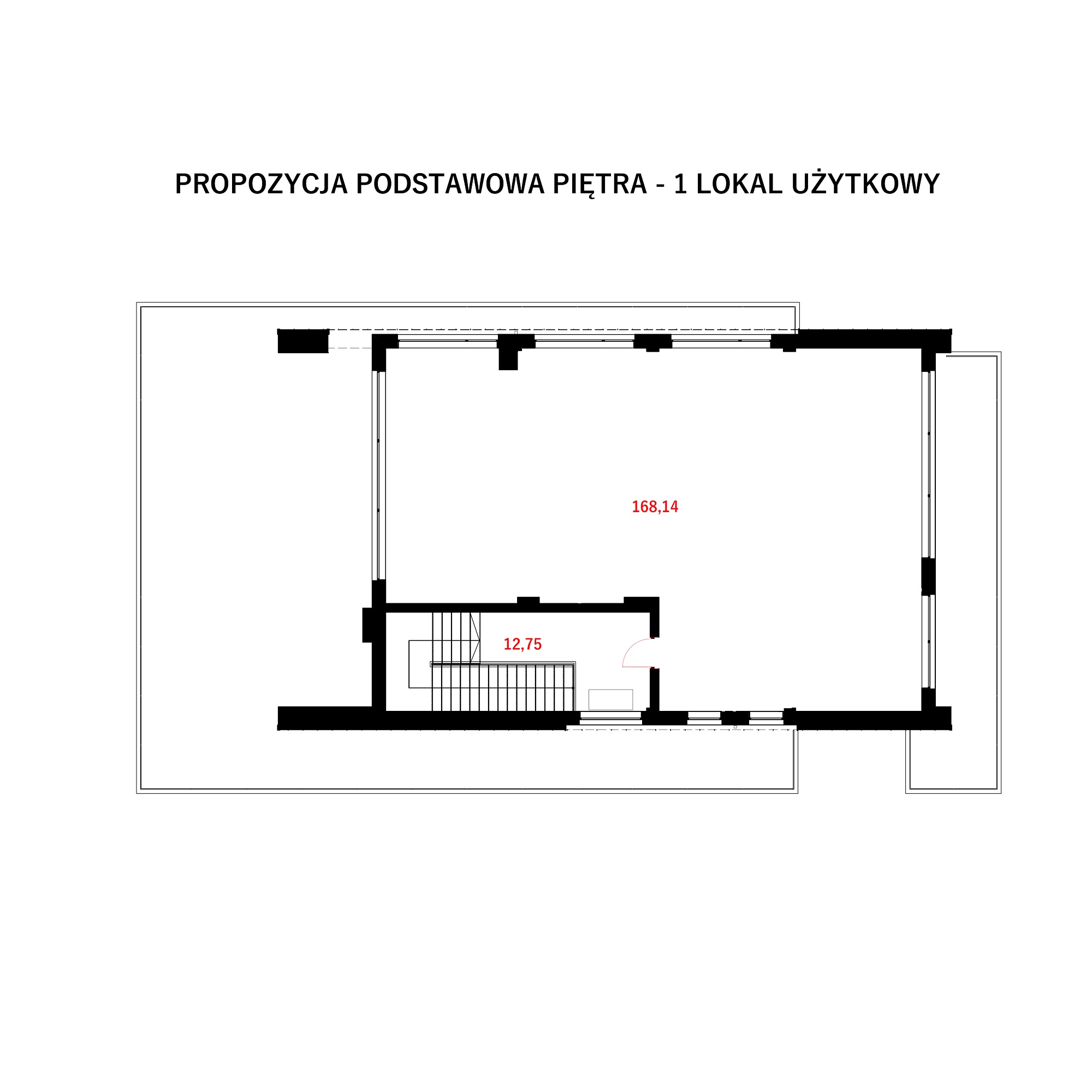 Prezentowany wariant 1 – podstawowy, bez ścian działowych, z wykorzystaniem na 1 lokal użytkowy. W tej wersji, piętro stanowi jedna przestrzeń typu open space do swobodnej aranżacji. O podziale i konkretnej funkcji Inwestor może zdecydować na etapie adaptacji projektu lub budowy, w zależności od zapotrzebowania konkretnych najemców. Może służyć na cele biurowe, lokal handlowy lub usługowy np. gastronomiczny (kawiarnia, pizzeria). Przestronny taras z pewnością będzie oblegany przez klientów w sezonie letnim. Dostęp do piętra dla osób niepełnosprawnych zapewnia się poprzez schodołaz lub platformę przyschodową zintegrowaną z poręczą, parkowaną na piętrze, z systemem przywołania na parter w razie konieczności.