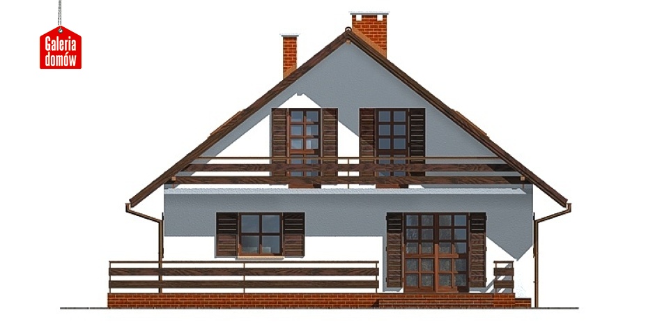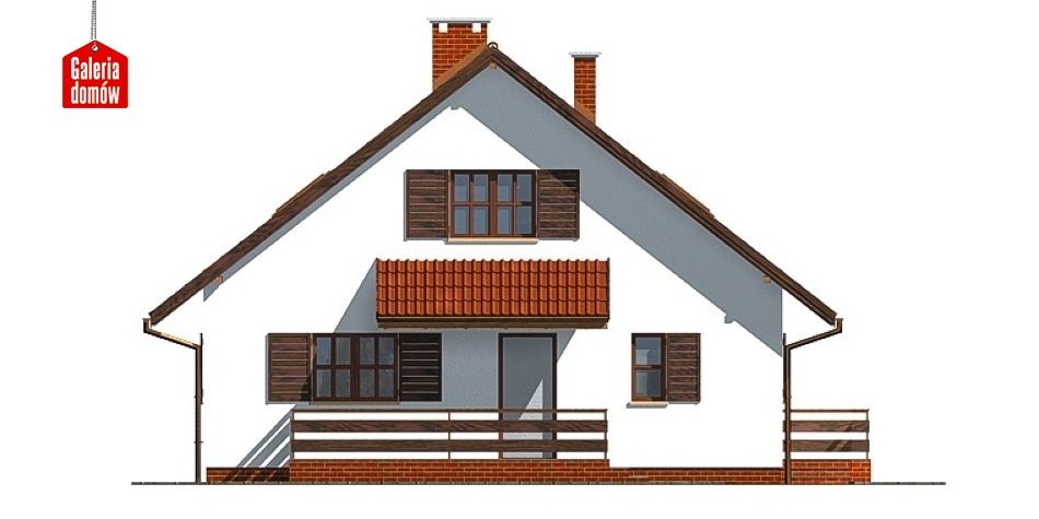 Klasyczny dom z poddaszem, o prostej bryle przykrytej dwuspadowym dachem, architekturą nawiązujący do tradycyjnego budownictwa. Balkon od strony ogrodu, daszek nad wejściem, drewniane okiennice, deskowanie na balustradach i biała elewacja podkreślają sielski charakter domu. Komfort użytkowania zapewnia funkcjonalny podział wnętrza na strefę dzienną i nocną. Na parterze znajduje się przestronny salon, z którego można wyjść na taras, duża kuchnia, łazienka i dodatkowy pokój. Na poddaszu zaprojektowano trzy przytulne i jasne sypialnie oraz drugą łazienkę.