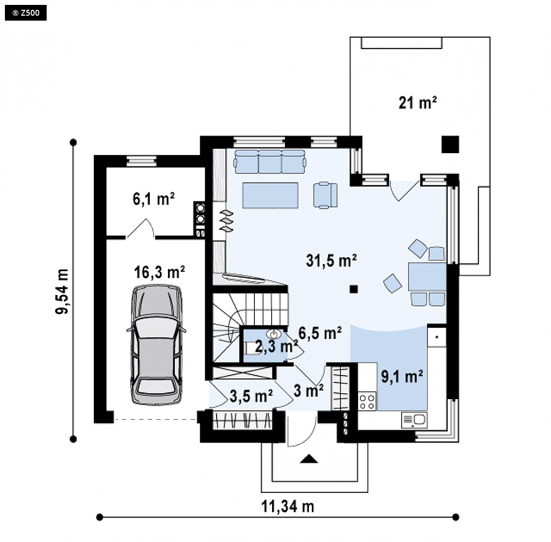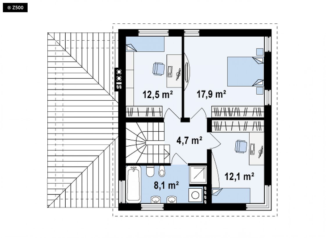 Zx47 to projekt domu o prostej bryle i konstrukcji nawiązującej do klasycznych wzorców modernistycznych. Świetnie nadaje się na działki miejskie. Detale wykończeniowe dodają domowi nowoczesności. Zaprojektowano tu dwie pełne kondygnacje, które dzielą się na dwie strefy. Parter to część dzienna, znajduje się tu przestronny salon, który tworzy otwartą przestrzeń z jadalnią i kuchnią. W lewym skrzydle domu znajduje się jednostanowiskowy garaż z bezpośrednim przejściem do sieni oraz pomieszczenia gospodarczego znajdującego się na jego tyłach. Piętro zaś to część nocna, znajdują się tu trzy wygodne sypialnie, każda z miejscem na dużą szafę, oraz komfortowa łazienka. Hol stanowi łącznik pomiędzy pomieszczeniami. Zx47 to oryginalny projekt dla osób, które cenią sobie wygodę i komfort mieszkania. Niebanalny i oryginalny wygląd domu będzie odzwierciedleniem kreatywnej duszy jego właściciela.
