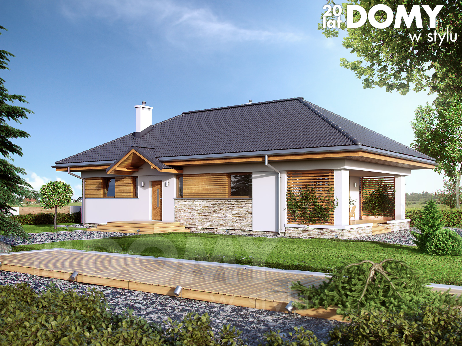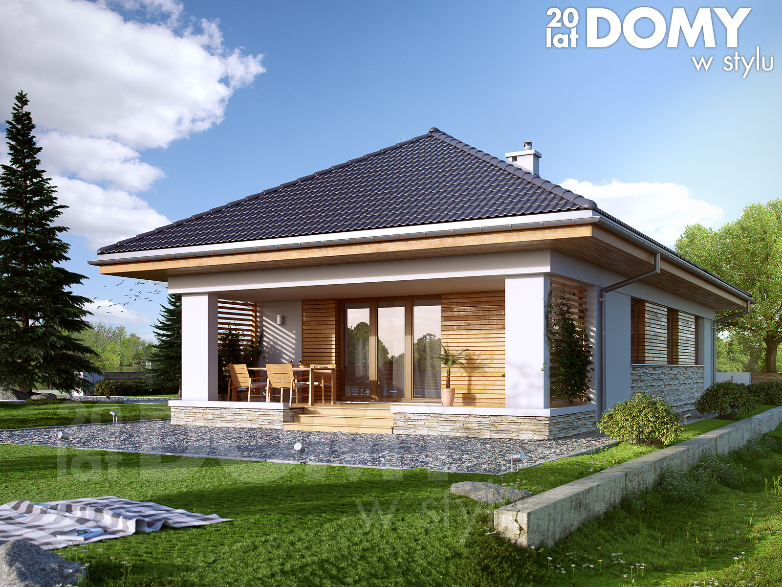 Jest to parterowy, nieduży (87 metrów kw. powierzchni użytkowej) dom dla 3-osobowej rodziny. Składa się z salonu łączonego z kuchnią do której przylega niewielka spiżarka, dwóch sypialni, w tym jedna dwuosobowa, łazienki i osobnej toalety. Brak podpiwniczenia i garażu. Jest to więc wersja oszczędnościowa domu. Podobnie można liczyć na oszczędności w trakcie użytkowania budynku. Zwarta bryła , szczelne okna i drzwi pozwalają na oszczędne wykorzystywanie energii do ogrzewania pomieszczeń. Dom jest funkcjonalny wewnątrz i bardzo efektowny z zewnątrz. Szczególną uwagę zwraca zaciszny taras, który z dwu stron okalają ażurowe ścianki z drewnianych listewek. Drewniana okleina, niczym boazeria, ozdabia też fragmenty ścian domu. Drewniana okładzina jest łączona z kamienną okładziną. Nowoczesny budynek nabiera cech rustykalnych, swojskich i tradycyjnych.