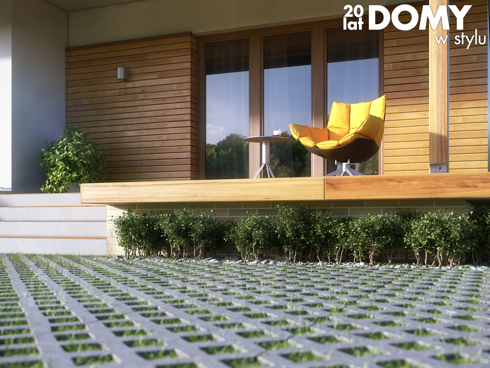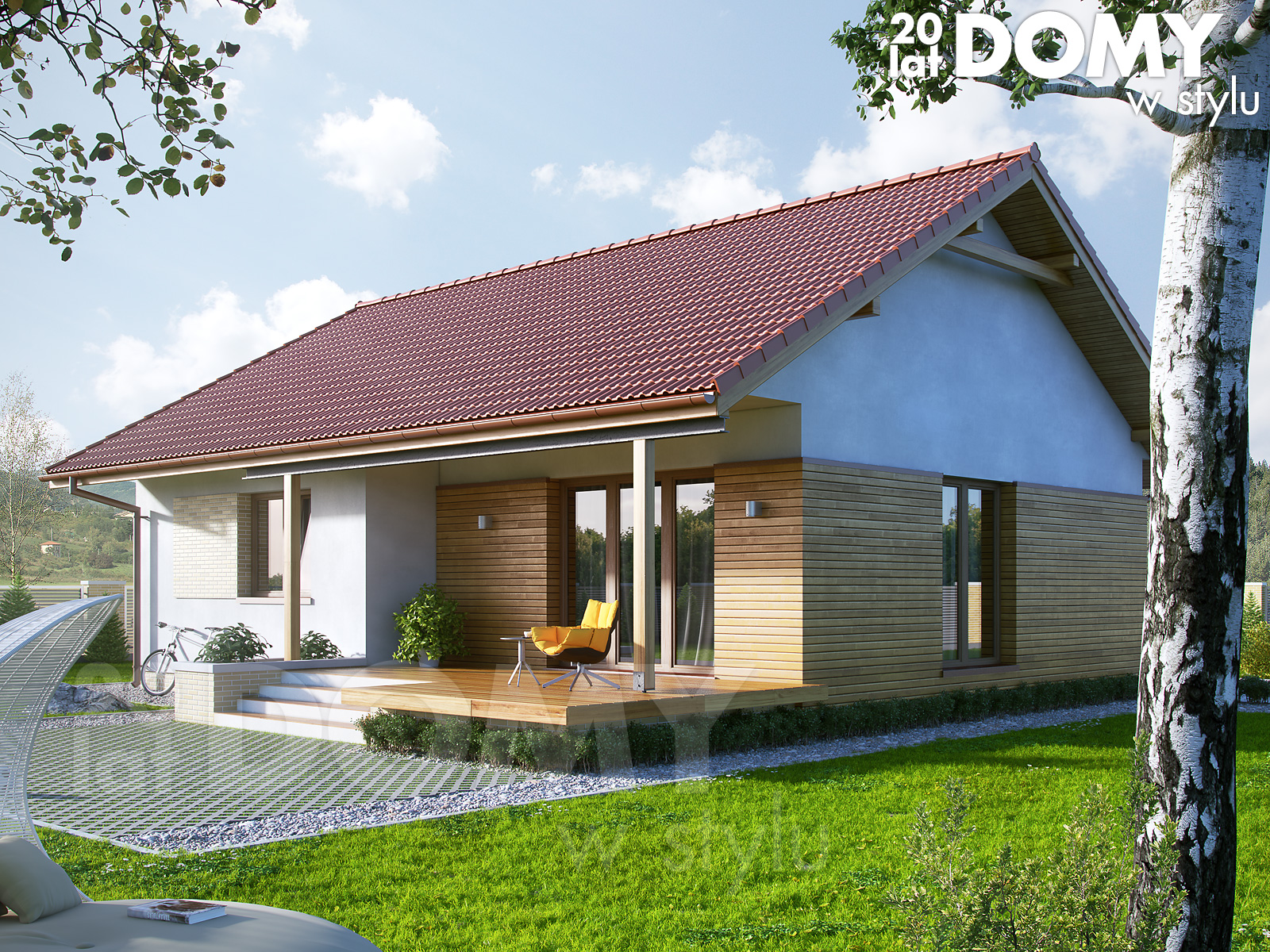 Niewielki dom parterowy, niepodpiwniczony, przeznaczony dla 3 -osobowej rodziny. Prosta, klasyczna bryła została przykryta dwuspadowym dachem. Atutem projektu jest jego zadaszony taras dostępny z salonu połączonego z jadalnią.Oprócz salonu w części dziennej znajduje się kuchnia ze spiżarnią. W części nocnej zaprojektowano dwie sypialnie i łazienkę.