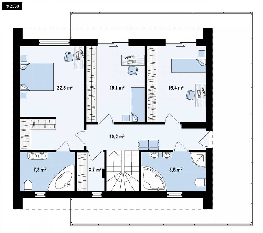 Zx55 to nowoczesny i funkcjonalny dom o eleganckiej formie architektonicznej i efektownie ukształtowanej przestrzeni wewnętrznej. Cechą wyróżniającą projekt jest obszerny taras na piętrze, który stanowi jednocześnie zadaszenie wejścia oraz tarasu na parterze.Połączenie bieli oraz kamienia na elewacjach tworzy spójną całość o wysokiej estetyce. Na parterze znajduje się komfortowa strefa dzienna z salonem oraz częściowo wydzieloną jadalnią i kuchnią. Można się do niej także dostać z holu przez centralnie usytuowane pomieszczenie gospodarcze. Zaprojektowano tu również dodatkowy pokój i dużą łazienkę z wydzieloną strefą pralni. Piętro to część nocna z trzema pokojami, ogólnodostępną łazienką i garderobą. Główna sypialnia to wydzielony apartament z własną garderobę oraz łazienkę. Z większości pomieszczeń prowadzi wyjście na przestronny taras. Projekt Zx55 będzie domem wyróżniającym się w sąsiedztwie nie tylko detalem, ale i kubistyczną formą.