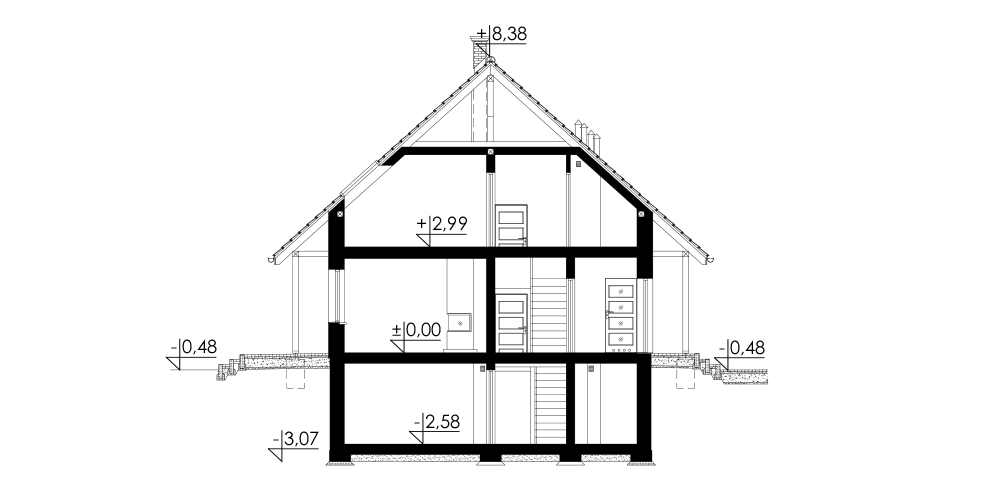 Dom jednorodzinny, wolnostojący, częściowo podpiwniczony, z poddaszem użytkowym i garażem jednostanowiskowym. Na układ funkcjonalny składają się salon z jadalnią i wyjściem na taras, 5 pokoi, kuchnia, 2 łazienki, garderoba, garaż, pralnia z suszarnią, 3 pomieszczenia gospodarcze.