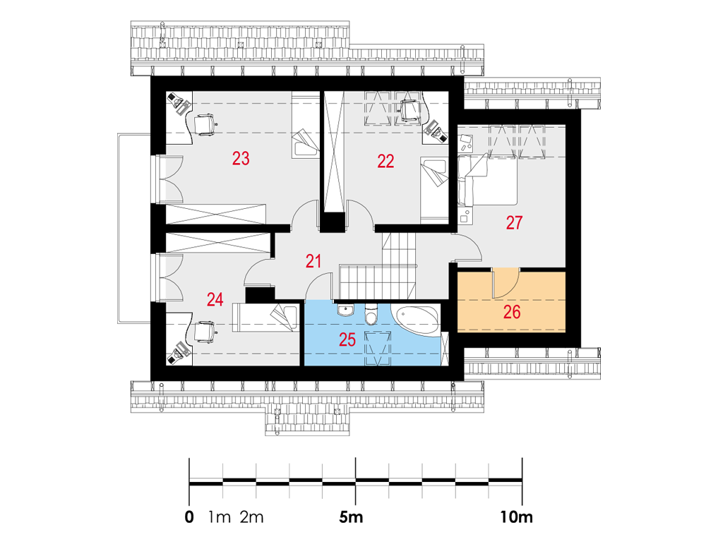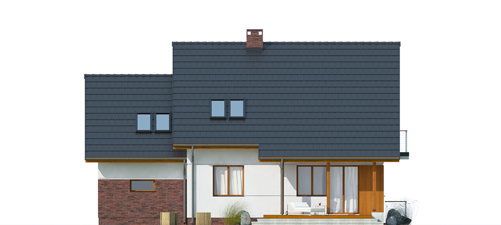 Dom jednorodzinny, wolnostojący, częściowo podpiwniczony, z poddaszem użytkowym i garażem jednostanowiskowym. Na układ funkcjonalny składają się salon z jadalnią i wyjściem na taras, 5 pokoi, kuchnia, 2 łazienki, garderoba, garaż, pralnia z suszarnią, 3 pomieszczenia gospodarcze.