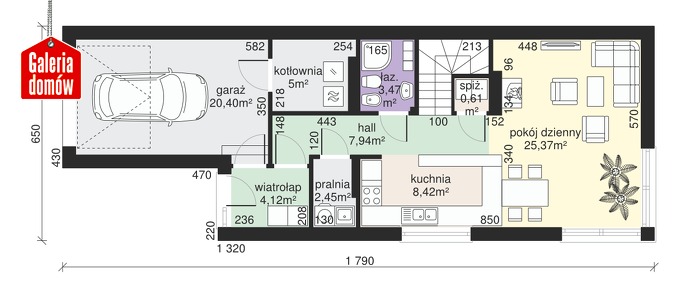 Zrobić coś dużego z czegoś małego? Sztuka! To bycie zaradnym i kreatywnym. Podobnie jak zbudowanie fajnego domu na dość wąskiej działce. Zobaczcie, jak to zrobiliśmy: pokój dzienny wychodzi na wschód, ale jest doświetlony przez duże, narożne okno. Garaż i taras na tak małej przestrzeni? Nie ma problemu - taras znajduje się na dachu garażu, dzięki czemu znikają drogie koszty zadaszenia. Można za to delektować się słońcem i świeżą kawą pitą pod chmurką. Dodatkowe ciepło zapewniają kolektory słoneczne zamontowane na dachu. Dla tych, którzy lubią zjeść, wygospodarowaliśmy miejsce na spiżarnię, garderobę i pralnię. Garaż częściowo obity kamieniem, poddasze – elegancką drewnianą okładziną w brązowym kolorze. Trochę praktycyzmu, szczypta wyobraźni i voila!