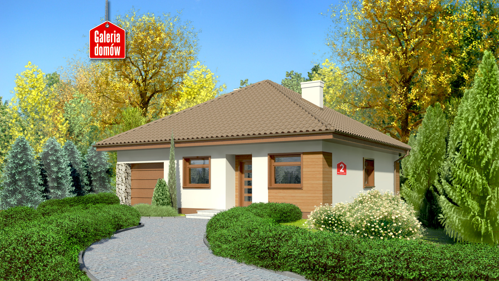 Komfortowy dom parterowy. Idealna propozycja dla osób praktycznych, poszukujących niewielkiego i ekonomicznego domu. Okładziny z drewna i kamienia na elewacjach nadają mu świeży, nowoczesny charakter i atrakcyjny wygląd. Wewnątrz zadbano o czytelny i funkcjonalny układ pomieszczeń. Program użytkowy obejmuje duży pokój dzienny z wyjściem na taras, otwartą kuchnię, dwie sypialnie i łazienkę. Dom posiada również garaż jednostanowiskowy i pomieszczenie gospodarcze z kotłownią.