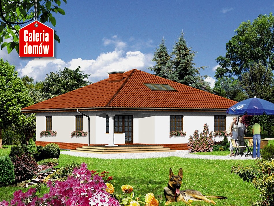 Dom przy Ogrodowej to projekt gotowy domu parterowego z jednostanowiskowym garażem. Klasyczna bryła na bazie kwadratu urozmaicona została poprzez wprowadzenie podcieni przy wejściu oraz od strony pokoju dziennego oraz wypuszczenie garażu. Logicznie zaprojektowany układ pomieszczeń dzieli budynek na dwie strefy: dzienną i sypialną. Część nocna to cztery pokoje oraz duża łazienka. Strefa dzienna to funkcjonalne połączenie pokoju dziennego, kuchni oraz spiżarni.
