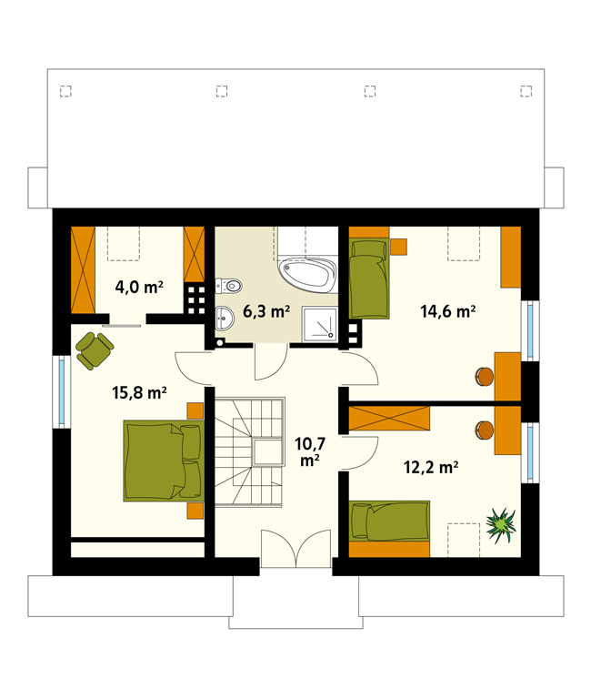 ARNIKA to optymalny dom z garażem w bryle budynku, zaprojektowany z myślą o 4-osobowej rodzinie. Niezaprzeczalnym atutem projektu jest zadaszony taras. Budynek charakteryzuje się wyraźnym podziałem na część dzienną, zlokalizowaną na parterze, oraz część nocną na poddaszu, składającą się z trzech sypialni. Kotłownia dostępna jest od strony garażu i ogrodu.