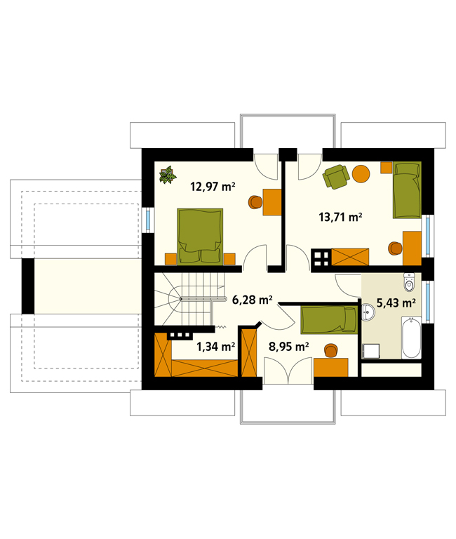AZALIA 5 to propozycja domu jednorodzinnego z poddaszem użytkowym, garażem i piwnicą. Na parterze oprócz części dziennej znajdziemy dodatkowy pokój. W piwnicy zaprojektowano kotłownię i dwa pomieszczenia gospodarcze. Na poddaszu znajdują się trzy sypialnie, łazienka i garderoba.