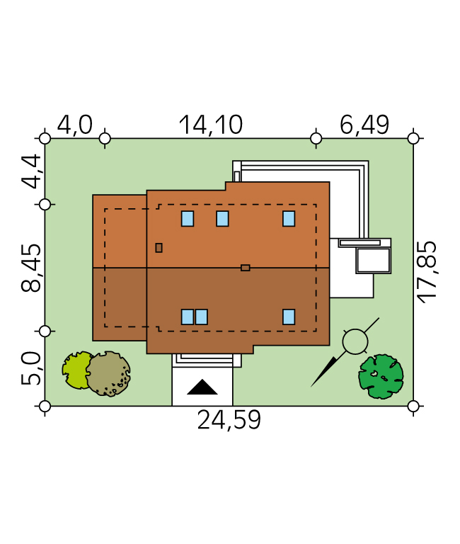 Dach: dwuspadowy, nachylenie 45°, pokrycie z dachówki ceramicznej