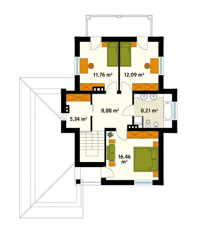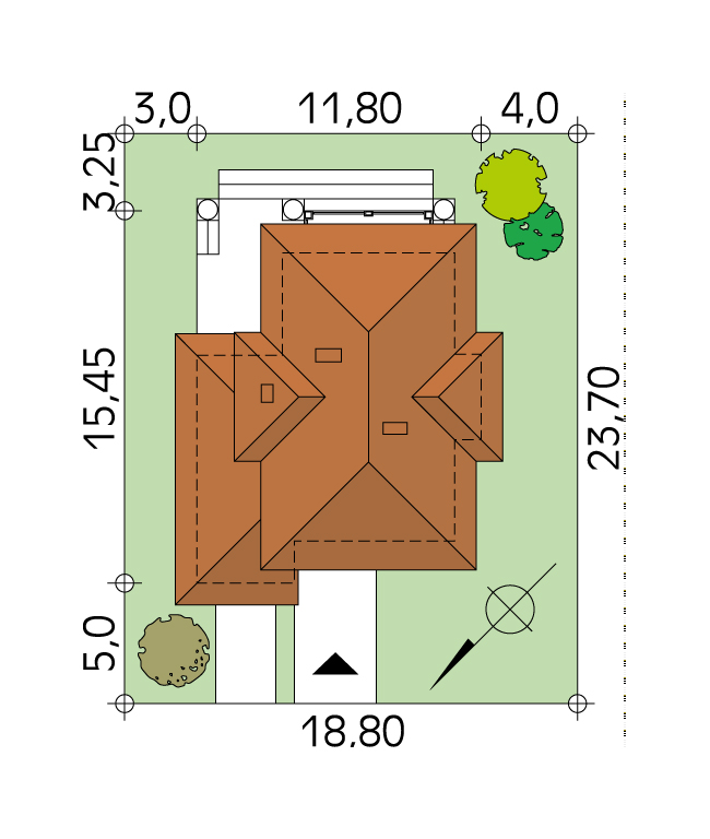 Dach: wielospadowy, nachylenie 21°, pokrycie z dachówki ceramicznej