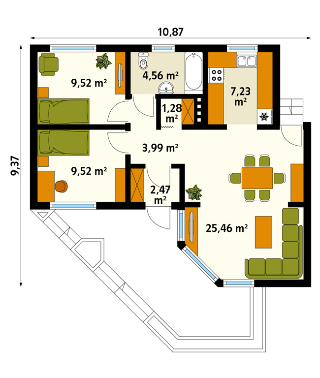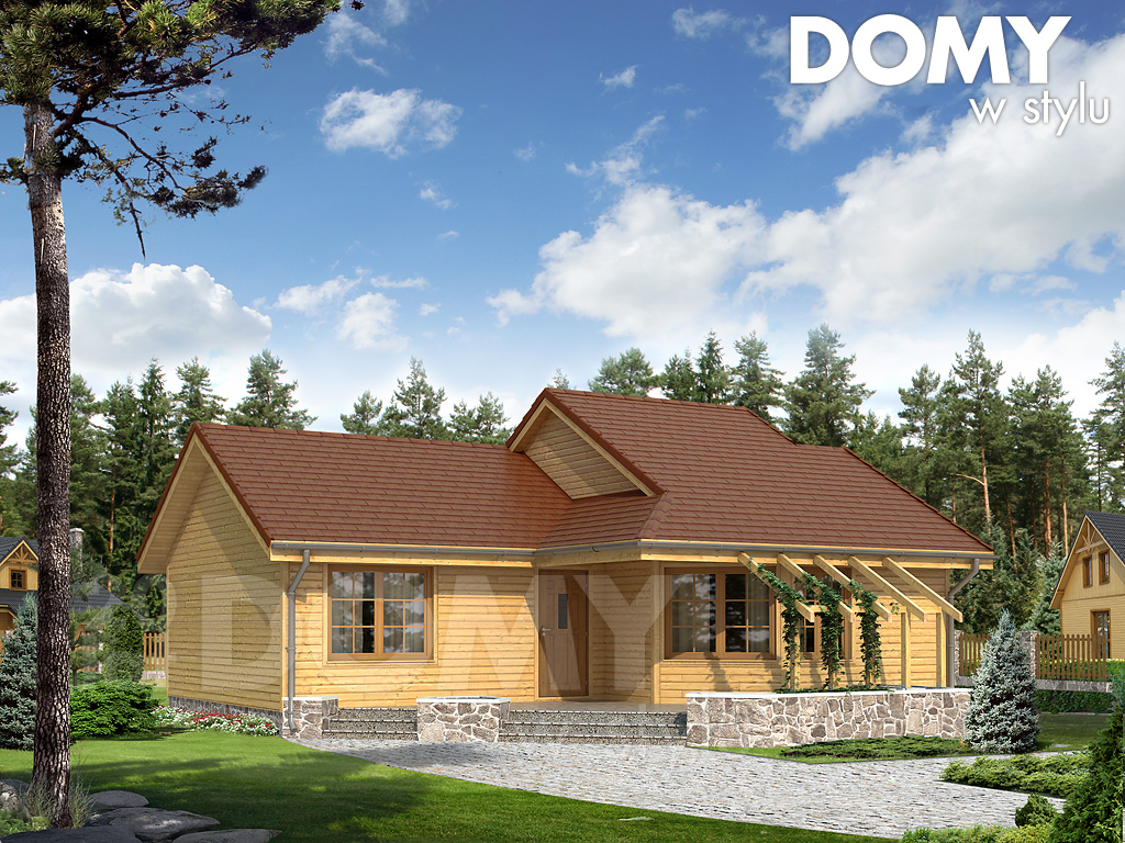 Parterowy domek letniskowy lub mieszkalny charakteryzujący się ciekawą bryłą i układem pomieszczeń. Idealny dla 2 – 3 osób. W projekcie zastosowano wyraźny podział na strefę dzienną i nocną. Od frontu zaprojektowano częściowo zadaszony taras z efektowną pergolą. W projekcie istnieje możliwość wygospodarowania dodatkowego pomieszczenia na poddaszu, doprojektowania garażu lub dodatkowych sypialni.