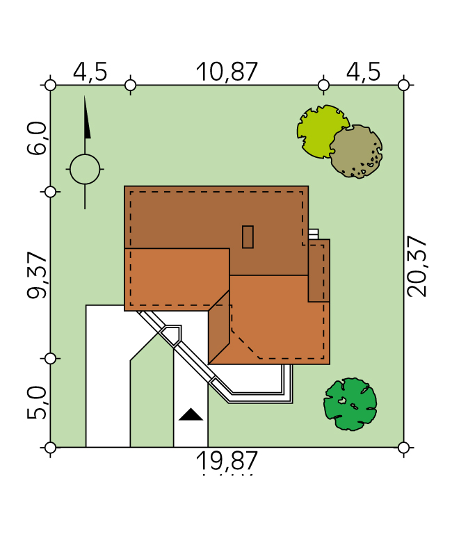 Dach: dwuspadowy, nachylenie 30°, pokrycie z dachówki bitumicznej