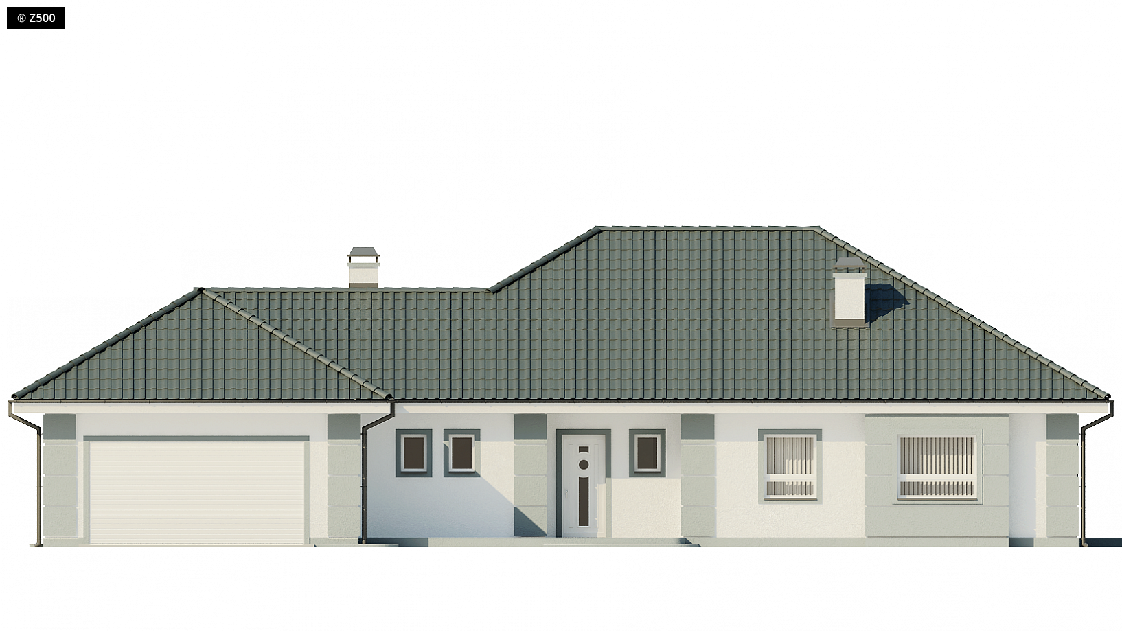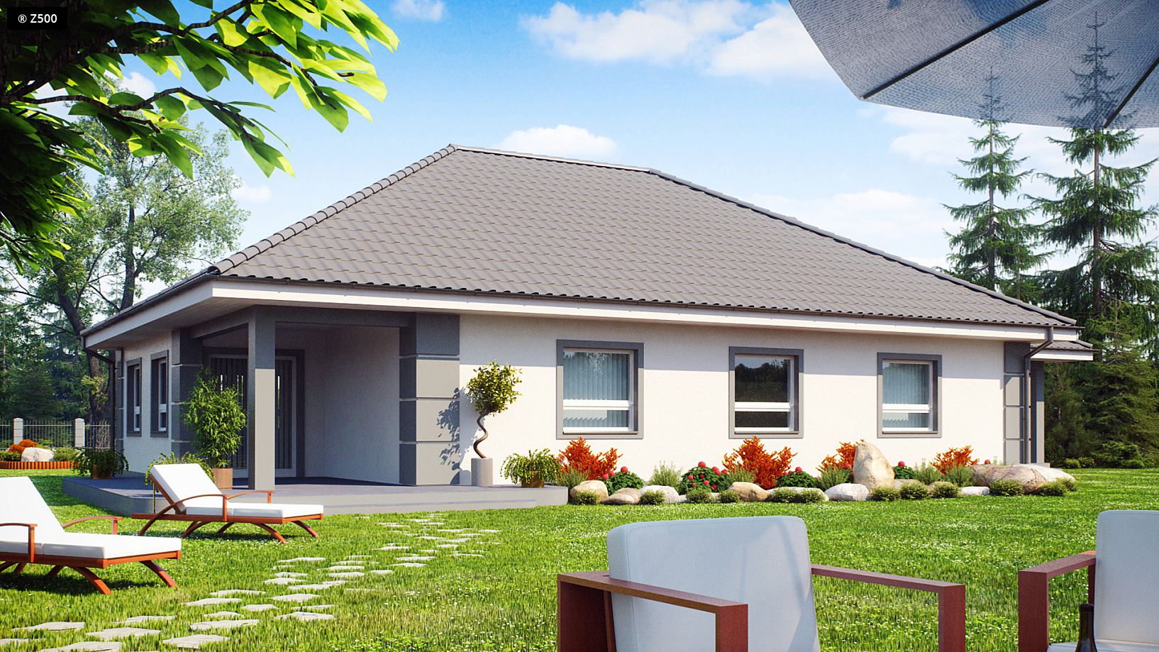 Projekt Z21 to kompleksowy dom, zawierający w swoim wnętrzu prawie wszystko, czego można oczekiwać od klasycznego domu parterowego. Bryła na planie prostokąta, z połączonym, wspólnym dachem,garażem na 2 auta wykończona została dzięki subtelnym detalom jak: dobrana kolorystyka, delikatne poziome bonie czy wykusz od frontu. Na większej działce dom prezentuje się jak gustowna rezydencja.Wnętrze dzieli się na strefy: dzienną, nocną i gospodarczą. Z głównego holu dostępna jest odizolowana część nocna domu z trzema fajnymi sypialniami i łazienką. Dodatkowo 'master bedroom' posiada własną pokaźną garderobę. Część dzienna to olbrzymi salon z kominkiem w jadalni i wyjściem na taras, połączony z częściowo otwartą kuchnią, która posiada spiżarkę. Można zrezygnować z wydzielenia kuchni wtedy uzyskujemy 52m2 otwartej przestrzeni. Taras jest w większej części solidnie zadaszony i może stanowić przedłużenie salonu czy letnią jadalnię. Istnieje możliwość zabudowy podcienia celem powiększenia powierzchni wypoczynkowej wewnątrz.Zaplecze gospodarcze domu to pomieszczenie techniczne z piecem oraz garaż dwustanowiskowy z wyjściem na ogród. W projekcie przewidziano także miejsce na szafy wnękowe oraz garderobę. Dużą łazienkę można podzielić na dwie mniejsze tak, aby jedna z nich dostępna była z pokoju. W miarę potrzeb, w kolejnym etapie inwestycji, istniej możliwość zagospodarowania strychu.