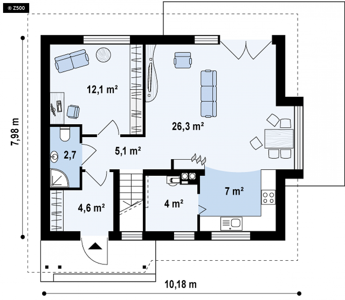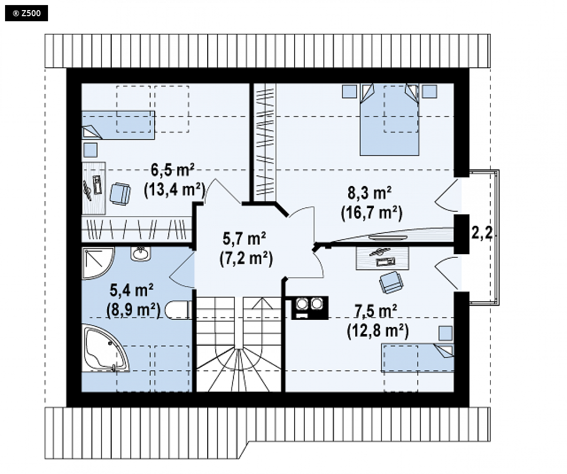 Projekt domu z101 to projekt funkcjonalny i tani w budowie ze względu na prostą konstrukcje dachu. Optymalny kąt nachylenia dachu oraz wyższa ścianka kolankowa pozwalają zagospodarować poddasze na 3 pokoje oraz wygodną łazienkę. Kolejnym atutem są gabaryty domu (pow . 120m2). Funkcjonale rozwiązanie układu pomieszczeń sprawia, że każdy m2, jest optymalnie wykorzystany. Dom ma wszystko na swoim miejscu: sień z miejscem na pojemną szafę a nawet garderobę, wc z miejscem na pralkę i natrysk, dużą spiżarkę z dostępem z kuchni oraz uroczy wykusz na jadalnię. Pomieszczenia gospodarcze zlokalizowane jest w optymalnym miejscu aby dom miał jeden komin dzięki temu ograniczamy koszty budowy. Na poddaszu mamy do dyspozycji trzy pokoje, które mają jedną wspólną łazienkę. Jest możliwość wykonania balkonu łączącego dwa pokoje.