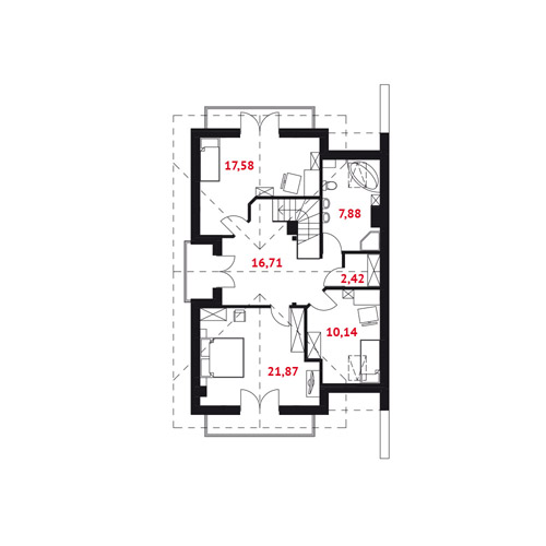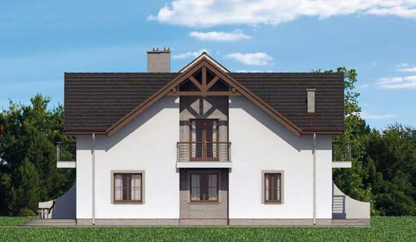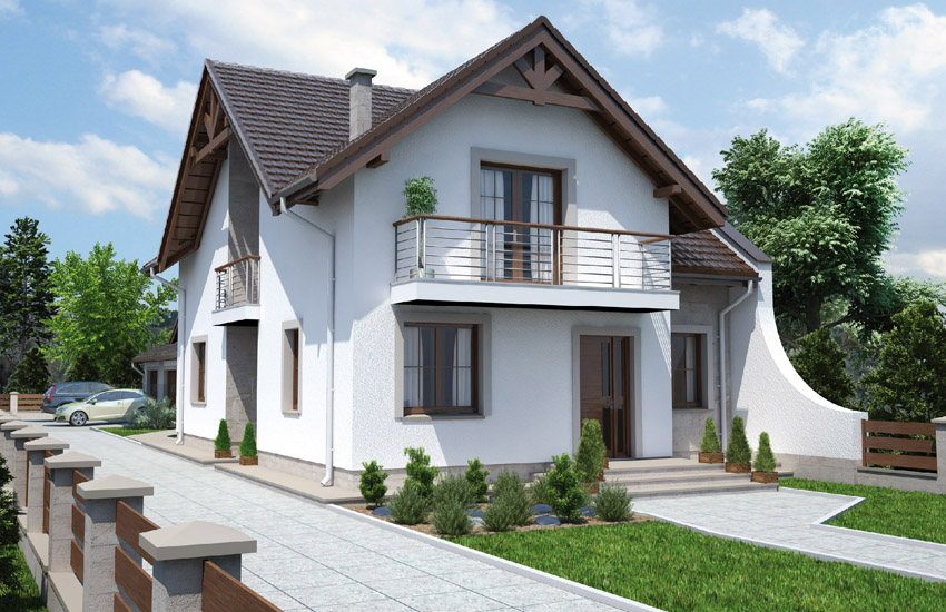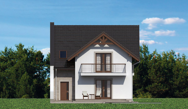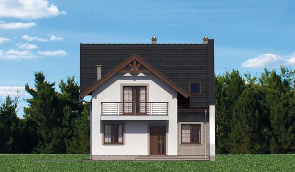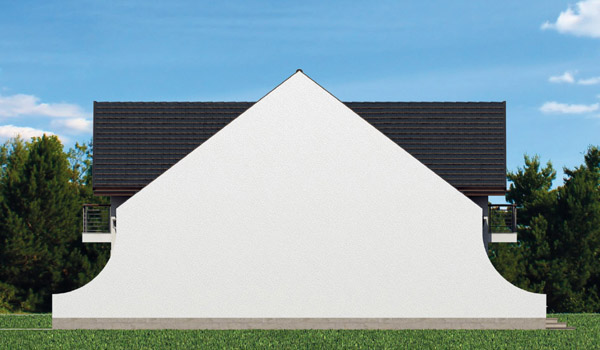 Przytulny dom parterowy z poddaszem użytkowym utrzymany w konwencji minimalizmu zwieńczony został dachem wielospadowym. Spokojna kolorystyka wraz z klasycznym stylem bryły idą w parze z prostą konstrukcją i łatwością budowy. Budynek urzeka lekkością formy i dbałością o detale. Harmonijne połączenie surowej bieli z delikatnym jasnym piaskowcem kontrastują z ciemnym, wyrazistym dachem dodając mu klasy i szyku. Niewielka szerokość oraz brak okien na jednej z elewacji bocznych powodują, że dom idealnie nadaje się na wąską działkę a nawet na budowę w granicy. Funkcjonalny rozkład pomieszczeń optymalnie wykorzystuje przestrzeń tworząc spójną całość i zapewniając komfort codziennego użytkowania. To propozycja dla osób szukających tradycyjnej szykowności we współczesnym wydaniu.