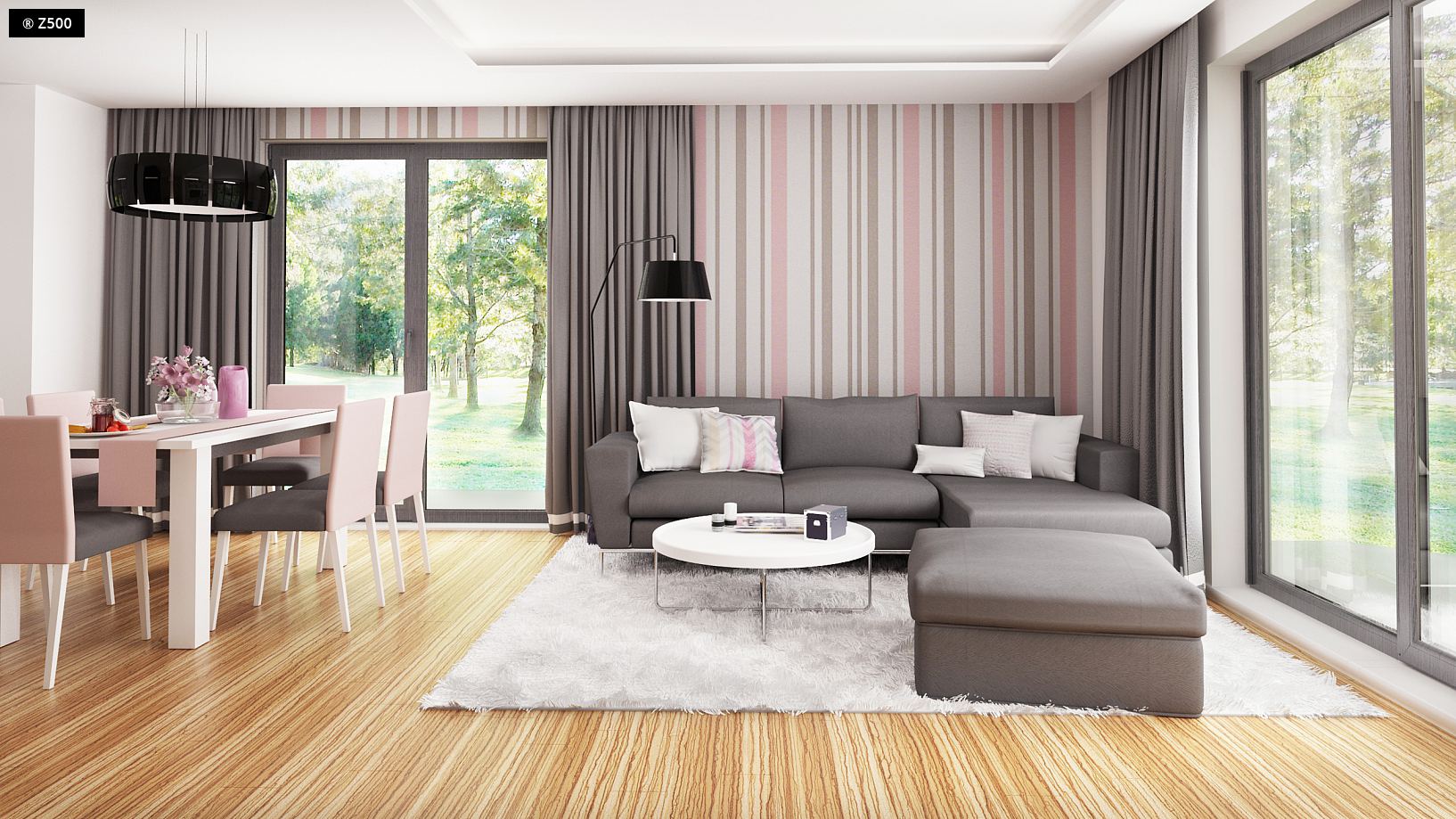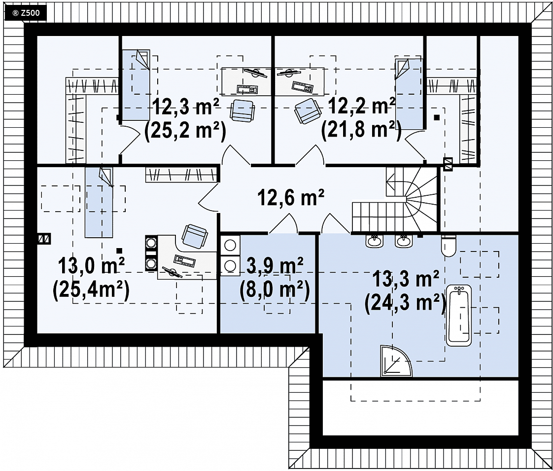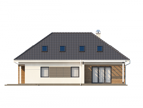 Z173 to wygodny projekt domu z poddaszem o przyjemnym charakterze. Zewnętrze ściany zdobią naturalne, drewniane elementy elewacji. Popielata dachówka doskonale komponuje się z brązową barwą stolarki okiennej. Prosta konstrukcja bryły podkreśla współczesny styl domu.W projekcie przewidziany jest także spory garaż dwustanowiskowy. Wnętrze domu jest przestronne i funkcjonalne. Jasny salon subtelnie połączony jest z jadalnią. Skrajnie usytuowany kominek zapewnia perfekcyjne ogrzanie wnętrza domu. Otwarta kompozycja kuchni optycznie powiększa całe pomieszczenie. Podręczna spiżarka to idealne miejsce do przechowywania większych zakupów i domowych przetworów. Funkcjonalny gabinet do pracy, może z powodzeniem pełnić rolę miłego pokoju gościnnego. Warto zwrócić uwagę na komfortową sypialnię z osobistą łazienką. Na piętrze znajdują się trzy przestronne sypialnie z prywatnymi garderobami. Komfortowa łazienka oddzielona jest od pralni osobnym pomieszczeniem.