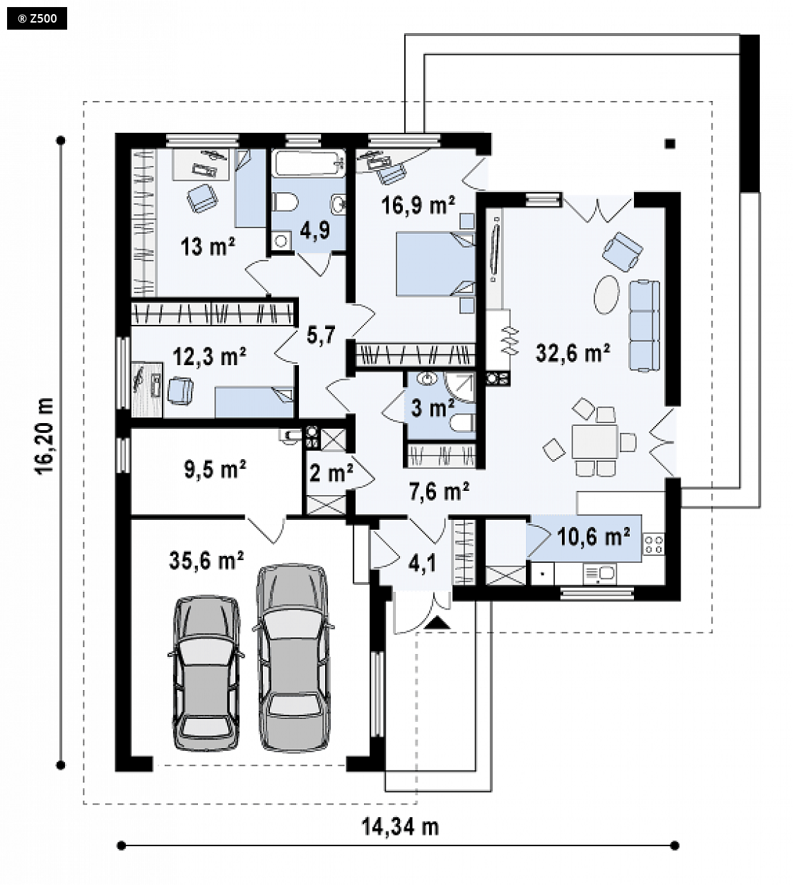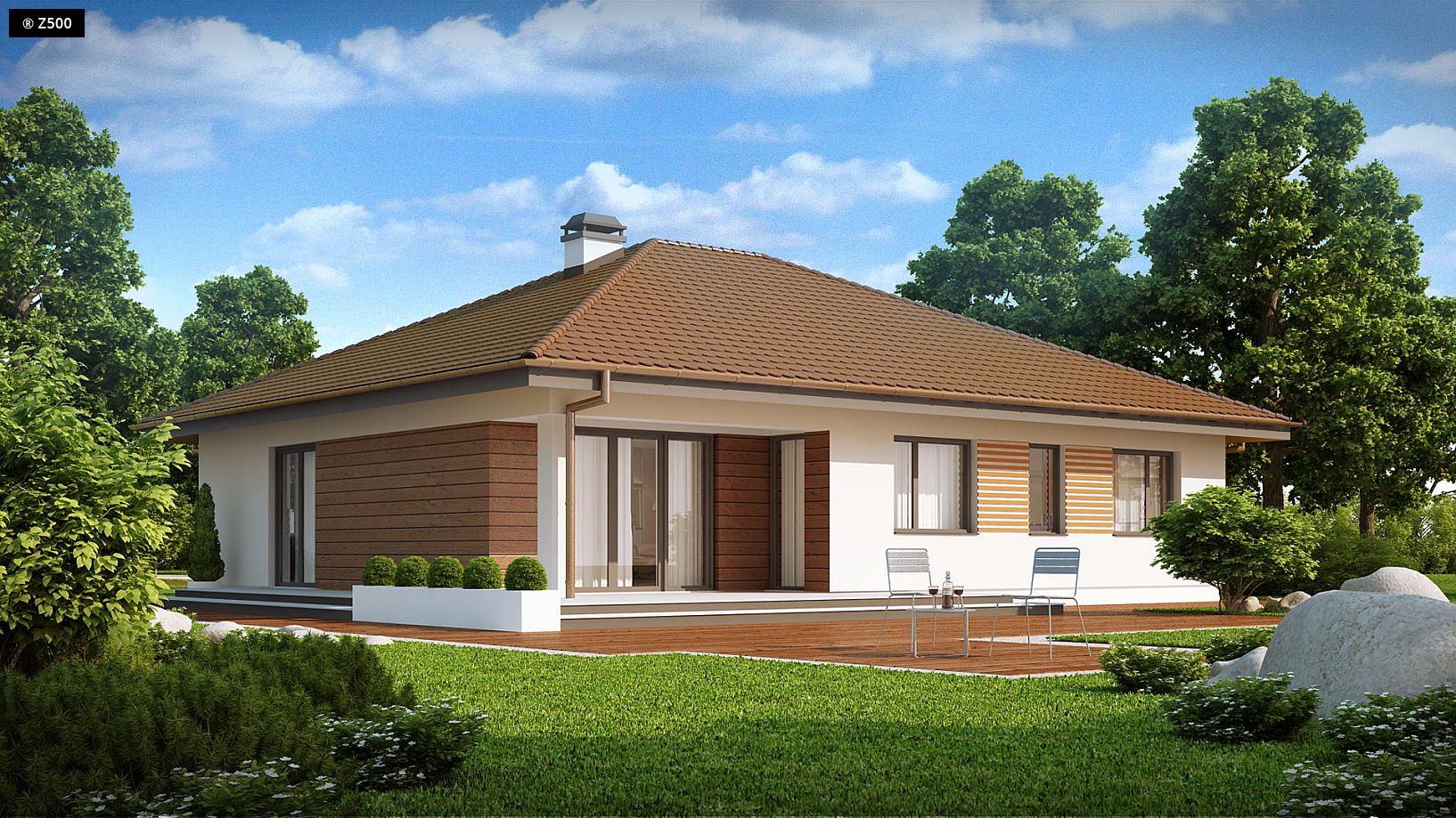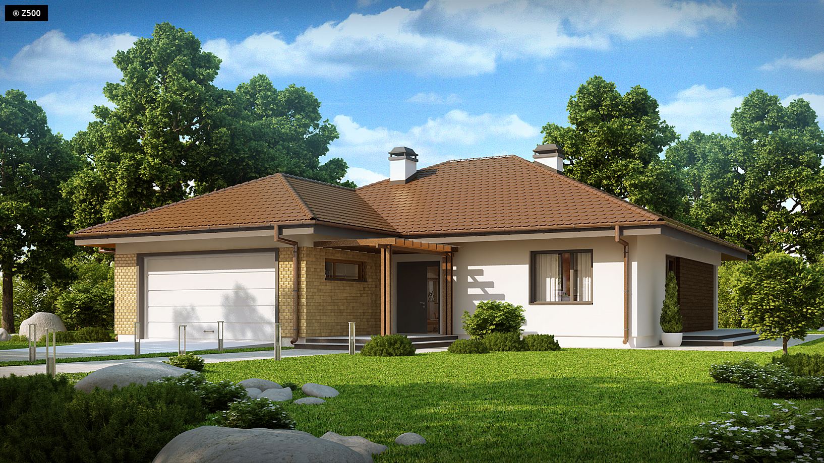 Projekt Z203 to funkcjonalny dom z trzema sypialniami i nieużytkowym poddaszem. Prostą, zgrabna bryłę urozmaica wysunięty od frontu garaż. Ostateczny charakter elewacjom nadaje wykończenie z drewna i okładziny klinkierowej. Bogaty program użytkowy rozwiązano wyłącznie na poziomie parteru. Główną zaletą projektu jest dwustanowiskowy garaż z dużym pomieszczeniem gospodarczym, które w razie potrzeby można dodatkowo powiększyć kosztem garderoby. W sieni i holu przewidziano miejsce na szafy i funkcjonalną garderobę. Strefa dzienna to kuchnia z podręczną spiżarnią otwarta na przestronny salon oraz aneks jadalny. W centrum zaplanowano kominek. Z salonu i jadalni można wyjść na zadaszony taras. Strefę nocną zlokalizowano w lewej części domu. Jest ona wyraźnie oddzielona, co zapewnia domownikom komfort i intymność. Są tu 3 wygodne sypialnie oraz łazienka z oknem. W każdej sypialni jest miejsce na dużą szafę Z pokoju gospodarzy jest także wyjście na zadaszony taras.