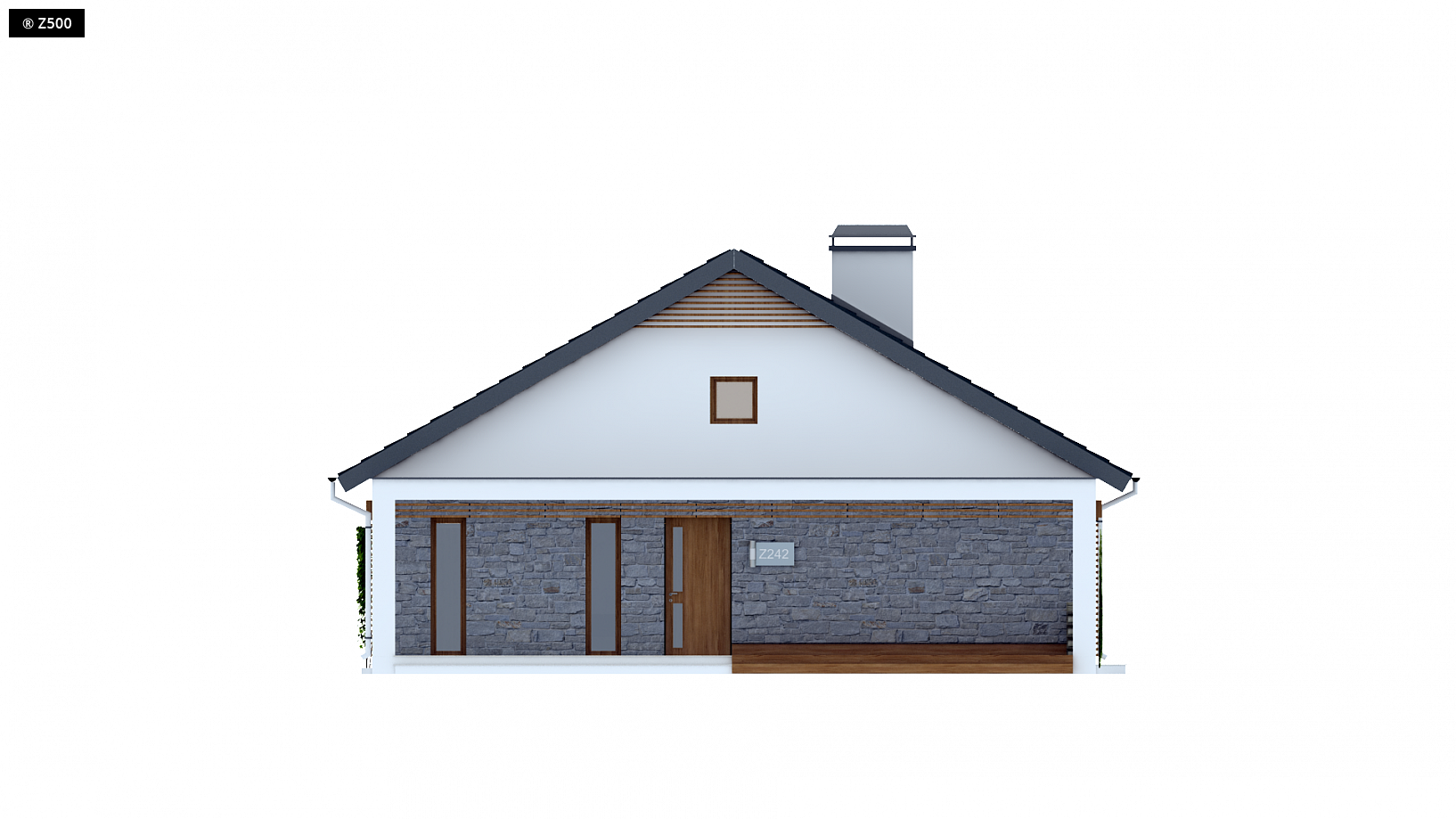 Z242 to średniej wielkości dom parterowy utrzymany w konwencji minimalizmu zwieńczony dachem dwuspadowym. Fragmentaryczne wykończenie ścian kamieniem elewacyjnym dodaje ciepła i wzbogaca formę. Strefa wejściowa do domu oraz część tarasu ogrodowego osłonięta jest "pergolą" nadającą lekkości. Z sieni z dostępem do obszernej garderoby dostajemy się do holu otwartego na część dzienną. Strefę tą stanowi duży jasny salon z kominkiem, jadalnią i wygodną kuchnią. Jednoprzestrzenna część dzienna posiada dostęp do tarasu z delikatnym zadaszeniem. Z holu mamy także dostęp do wspólnej łazienki oraz dwóch dużych sypialni. Wszystkie pokoje mieszkalne posiadają wyjścia do ogrodu. Przy pozornie niedużej powierzchni dom jest funkcjonalny i obszerny. Zwarta bryła umożliwia lokalizację tego domu na wąskiej działce oraz oszczędność na eksploatacji domu. W przyszłości można zagospodarować poddasze, co powiększy przestrzeń użytkową wnętrza.