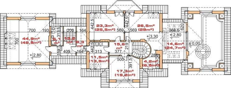 Dach: wielospadowy, nachylenie 45°, pokrycie z dachówki ceramicznej lub betonowej